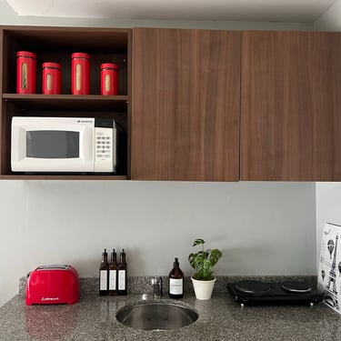 - Cocina integrada equipada: microondas, anafe eléctrico, hervidor eléctrico y menaje completo